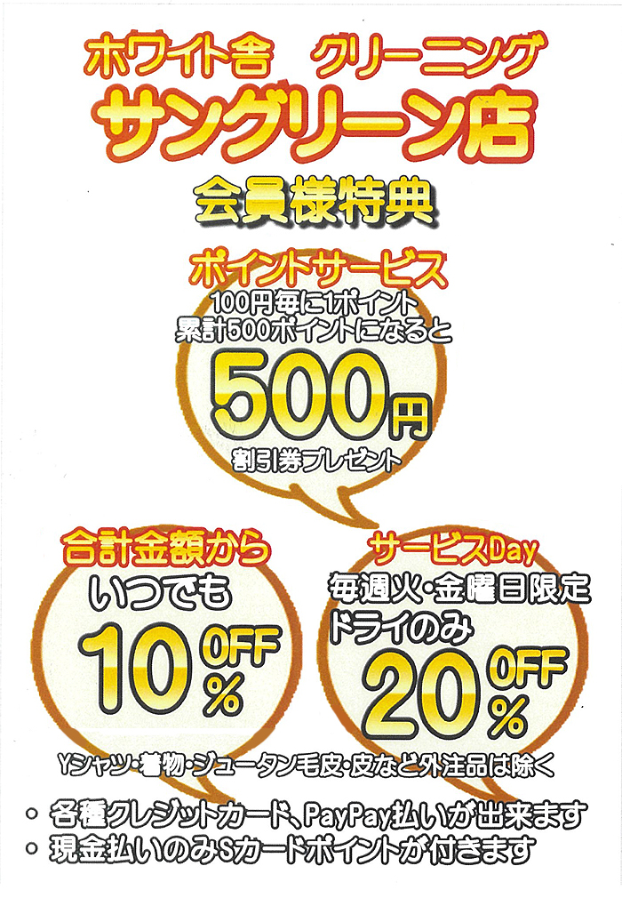 毎週火・金曜日はドライクリーニング料金20%OFF。