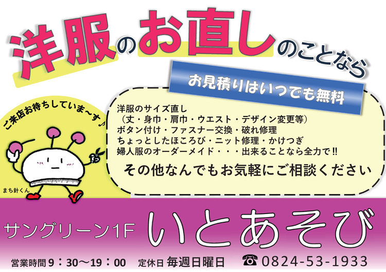 新しいお洋服はもちろん、思い入れのある大切なお洋服のお直しなどお客様のご希望にそえるよう日々努力して参ります。